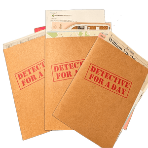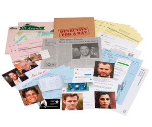 Detective for a Day ist kein Brettspiel. Du bekommst eine Mappe mit etwa 40 verschiedenen Beweisstücken. Zusätzlich zu den Beweisen bekommst du fünf Umschläge, die du nach und nach öffnen kannst, wenn deine Ermittlungen voranschreiten.